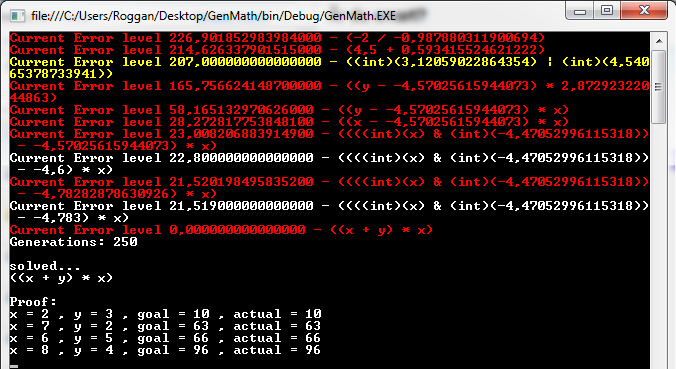 As you can see on the screenshot, the application have solved the equation in 250 generations (a few milliseconds).