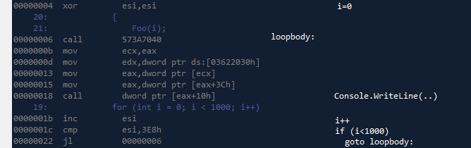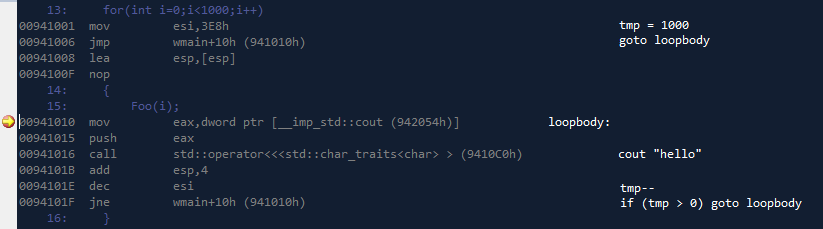 Just like the C++ version, the variable “i” have been replaced with a native register, “esi”