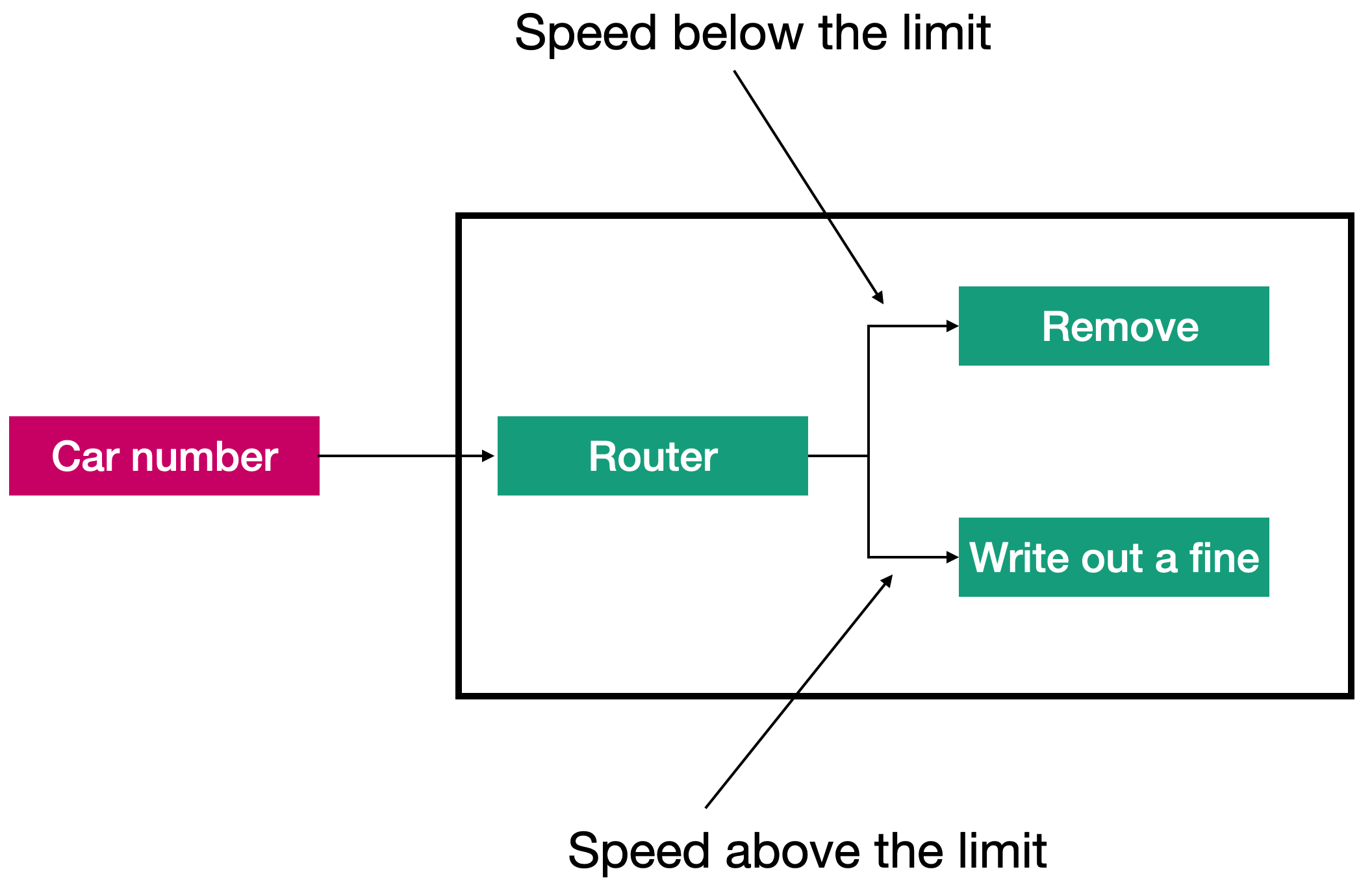 We will consider the router pattern on a specific example. This example will be an application for working with traffic cameras. This application will analyze the speed of the car, and if the speed exceeds the set limit, a fine will be issued, but if the speed is below the set limit, the message containing the number and speed of the car will be deleted.