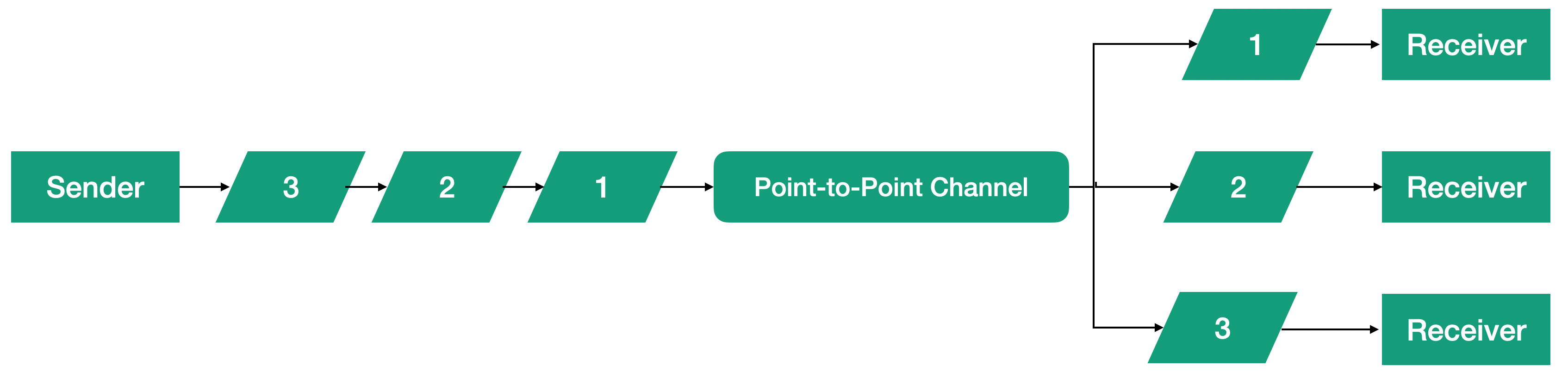 Another feature of this type of channel is that messages are delivered to the recipient in the same order as they were sent. The point-to-point channel delivers the message to exactly one recipient, as shown in the figure.