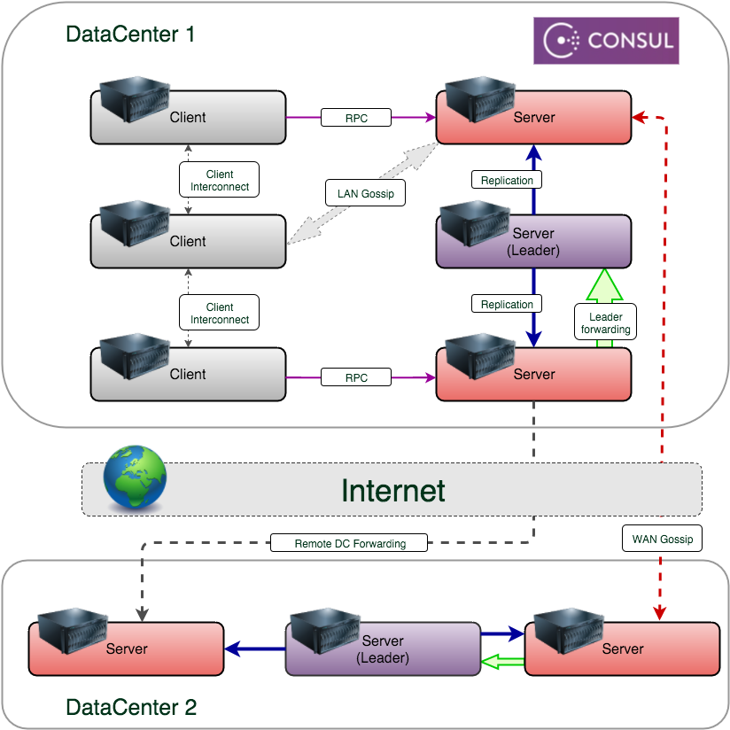 A Consul cluster is a network of connected nodes that run services registered in the cluster. Consul ensures that information about the cluster will be distributed to all cluster members and is available on request. It also supports not only a peer-to-peer cluster but also a multi-peer cluster divided into zones, which are called DataCenters in the Consul terminology. With the help of Consul, you can work with a particular data center and perform actions on any other. Datacenters are not isolated from each other within a cluster. An agent in one data center can get information from another data center, which can help build an effective distributed system.